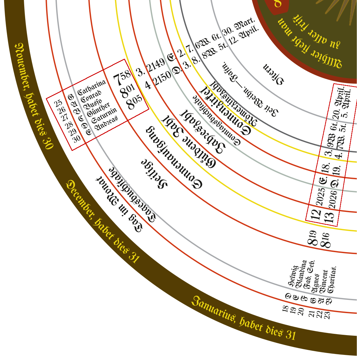 Die äußeren sechs Ringe gelten für jedes beliebige Jahr. Im äußersten Ring steht die Anzahl Tage für jeden Monat – allerdings als ausgeschriebener Satz in lateinischer Sprache: November, habet dies 30. December, habet dies 31. usw.