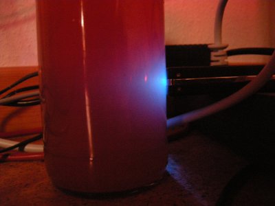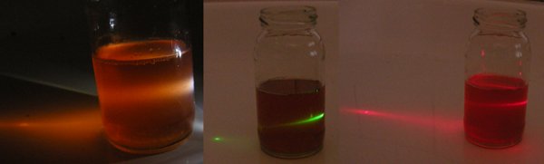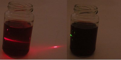 Überraschenderweise hat der aus dem Öl austretende Lichtstrahl an der Wand jedoch einen grünen Fleck erzeugt. Das ist zunächst rätsehaft – wenn das blaue Licht absorbiert wird, sollte es verschwinden und nicht seine Farbe ändern. Ein Blick durch das Handspektroskop von astromedia brachte die Erklärung – das Licht der blauen LED war nicht monochromatisch, sondern erstreckte sich vom violetten bis in den grünen Bereich (etwa 430–530 nm). Das Grün wird vom Olivenöl aber durchgelassen und erzeugte daher den grünen Fleck.