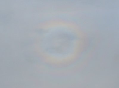 Auf unserem Flug nach Island waren für einen Moment auf den Wolken unter dem Flugzeug diese farbigen Lichtringe zu sehen. Erst dachten wir, wir würden endlich mal einen vollständigen Regenbogen sehen (das heißt, wir dachten erst gar nicht, sondern beeilten uns, das Foto zustandezubringen …). Aber sehr schnell war klar, dass diese Ringe viel zu klein waren für einen Regenbogen. In der Ausdehnung ähnelten sie eher einer Korona – aber Koronen sieht man immer um die Lichtquelle (in der Regel der Mond, weil die Sonne zu helle ist); diese Ringe fanden sich aber um den Gegenpunkt zur Sonne. Es handelt sich um eine Glorie.