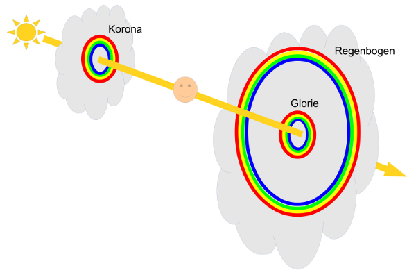 Die farbigen Ringe der Glorien entstehen also um den Sonnengegenpunkt, das Licht muss daher zurückgestreut werden, während es bei der Korona in Vorwärtsrichtung gestreut wird. Beim Regenbogen wird das Licht ebenfalls zurückgestreut, aber nicht genau um 180° zurück, sondern nur um 138°. Dadurch erklärt sich auch der Öffnungswinkel beim Regenbogen von 42°. Alle drei Phänomene brauchen Wassertropfen zu ihrer Entstehung und treten deshalb im Zusammenhang mit Wolken auf.