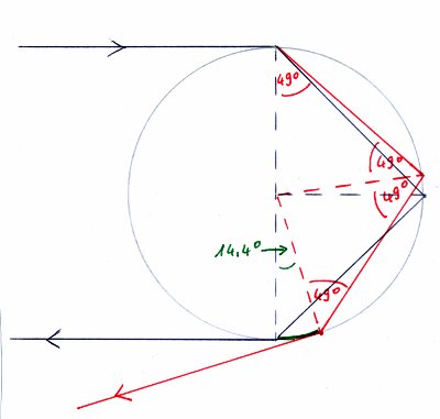 Ein tangential einfallender Strahl verläuft nun aber – in seinem Berührungspunkt mit der Oberfläche – parallel zur Oberfläche, er wird also umgekehrt zum obigen Strahlenverlauf im Winkel dieser 49° in den Tropfen hinein gebrochen. Anschließend wird der Strahl an der Rückwand des Tropfens reflektiert, wobei Einfallswinkel = Ausfallswinkel gilt. Dabei muss man beachten, dass die Winkel sich beziehen auf den Radius, der im Reflexionspunkt senkrecht auf der Tropfenoberfläche steht. Der Strahl trifft dann wieder von innen auf die Tropfenwand und zwar aus geometrischen Gründen wieder im Winkel von 49°, dem Grenzwinkel der Totalreflexion. Der Strahl wird also totalreflektiert und in die Tropfenoberfläche hinein gebrochen, verläuft also parallel zu dieser. Wenn auch nur in einem Punkt, denn er verlässt den Tropfen dann tangential.