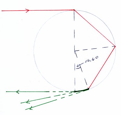 Der Austrittspunkt des Strahls liegt aber nicht dem Eintrittspunkt genau gegenüber, sondern ein Stück nach hinten versetzt (um den Fehlwinkel von 14,4°, siehe Abb. 3). Der Strahl, der den Tropfen verlässt, hat deshalb nur einen Winkel von 165,6° zum einfallenden Strahl statt der erhofften 180°.