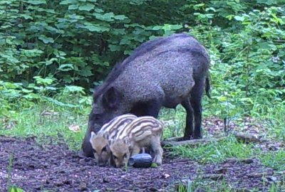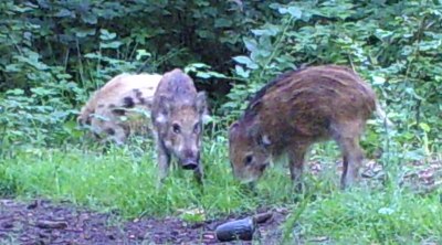 Diese drei Schweine sind noch recht jung, die beiden dunklen haben noch Reste der Streifen. Das fleckige hat wohl Vorfahren unter den Hausschweinen. Diese wurden früher von den Bauern zur Mast in den Wald getrieben.